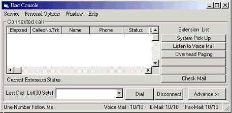 TelePCX 提供屏幕電話使用界面(User Console),提供每一個(gè)分機(jī)使用者一個(gè)GUI的計(jì)算機(jī)操控畫面,無論電話進(jìn)線時(shí)的聲響提示,Caller ID實(shí)時(shí)顯示以及完整的電話控制,從應(yīng)答,撥號(hào),轉(zhuǎn)接乃至各種復(fù)雜的功能設(shè)置如:電話會(huì)議(多方通話)、多線電話跳接、通話中聯(lián)機(jī)實(shí)時(shí)錄音……等,均可經(jīng)由點(diǎn)按鼠標(biāo),由計(jì)算機(jī)上的畫面做實(shí)時(shí)的控制,不必記憶復(fù)雜的操作步驟或查詢使用手冊(cè),方便簡易。