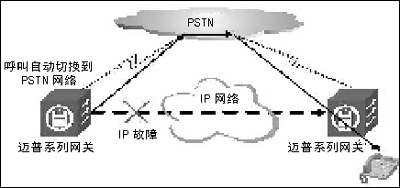 利用這一機制,網(wǎng)絡管理員也可以為每個撥號端配置一條備份路由,這個備份路由可以通往IP網(wǎng)方向也可以通向PSTN方向,當主路由不通時路徑選擇算法就將自動把下一次呼叫切換到備份路由,實現(xiàn)IP-PSTN切換。