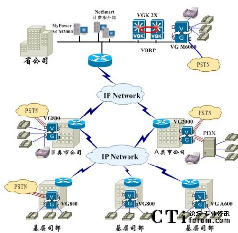 在此典型應(yīng)用中,省公司采用VG M6000,配置32FXO接入卡和E1中繼卡,實(shí)現(xiàn)大容量接入和本地PSTN落地;地市B采用VG800,配置FXO模擬接入卡和FXS模擬中繼卡,實(shí)現(xiàn)本地電話接入和PSTN落地;地市A采用VG2000,將PBX電話接入IP電話網(wǎng)絡(luò),并實(shí)現(xiàn)本地PSTN落地;基層公司根據(jù)容量需求,分別采用VG800或者VG A600實(shí)現(xiàn)電話接入。省公司配置兩臺(tái)邁普IP語音網(wǎng)守VGK 2X,運(yùn)行VBRP協(xié)議,實(shí)現(xiàn)網(wǎng)守?zé)醾,充分保證整個(gè)網(wǎng)絡(luò)的可靠性。