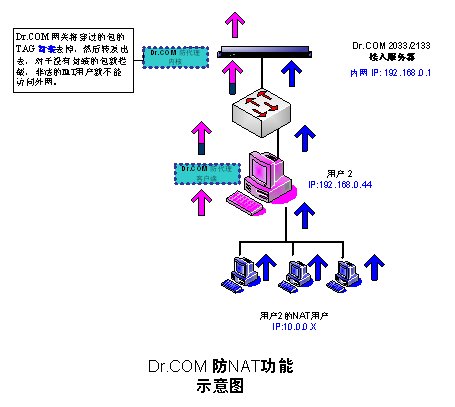 共享合法用戶的身份的NAT用戶,由于他們發(fā)出的數(shù)據(jù)包是沒有經(jīng)過封裝的,雖然經(jīng)過合法用戶的電腦實(shí)現(xiàn)了地址轉(zhuǎn)換,但Dr.COM的防代理客戶端不會(huì)對這些NAT用戶的數(shù)據(jù)包進(jìn)行封裝,所以這些數(shù)據(jù)包就在網(wǎng)關(guān)被過濾掉,代理用戶就不能正常上網(wǎng)。