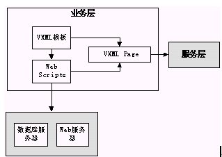 通過上圖可以看出,二次開發(fā)的主要任務(wù)就是業(yè)務(wù)層的開發(fā),簡單的說,就是以Voice XML為核心,以Web Scripts語言為業(yè)務(wù)接口,形成完整的業(yè)務(wù)流程交由服務(wù)層處理。