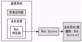 從上圖可以看出,座席端所有的業(yè)務(wù)處理都是在Web瀏覽器上進(jìn)行的,所以無論是利用原有系統(tǒng)還是新開發(fā)系統(tǒng),用戶都不必要關(guān)心座席的具體實(shí)現(xiàn)方式,要做的僅僅是編寫新的JSP,ASP等可訪問后臺業(yè)務(wù)的Web頁面,然后進(jìn)行簡單的配置就可以完成業(yè)務(wù)的擴(kuò)充功能。