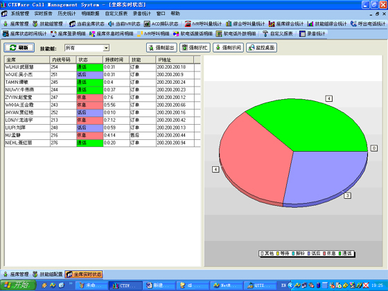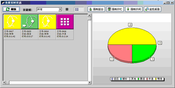 當前座席狀態(tài):能夠提供座席的狀態(tài)表示,狀態(tài)持續(xù)時間,對應的技能組,對應的分機號碼,對應的IP地址等信息。可以對任何一個座席進行強制簽出、強制示忙、強制示閑操作?梢詫θ我庾M行屏幕監(jiān)控操作(無需任何第三方軟件)。