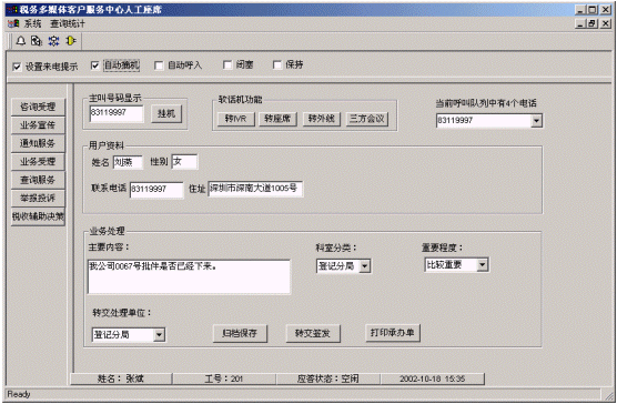 客戶打入電話后,當(dāng)系統(tǒng)的自動(dòng)語音應(yīng)答子系統(tǒng)無法解決納稅人問題時(shí),客戶可選擇人工服務(wù),由客戶服務(wù)代表直接接聽納稅人電話,處理并解決納稅人問題。此時(shí)納稅人同座席話務(wù)人員直接溝通,并同時(shí)記錄下該客戶的聯(lián)系方式,將相關(guān)數(shù)據(jù)添加入系統(tǒng)數(shù)據(jù)庫;也可以在數(shù)據(jù)庫的支持下回答國家和地方的稅收政策及相關(guān)規(guī)定等的咨詢和疑問。客戶也可以選擇自動(dòng)語音服務(wù)方式,根據(jù)系統(tǒng)的語音提示輸入按鍵,選擇類別,將自己的投訴和建議以及自己的聯(lián)系方式信息以留言錄音的方式保存在系統(tǒng)中。系統(tǒng)同時(shí)還支持自動(dòng)傳真方式,客戶可以通過傳真機(jī)進(jìn)入本系統(tǒng),通過按鍵選擇傳真方式,將自己的意見建議等的文本內(nèi)容傳真給系統(tǒng),系統(tǒng)自動(dòng)接受并存入數(shù)據(jù)庫。