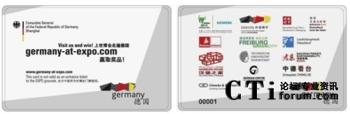 CTI論壇(ctiforum)5月17日消息(記者 潘婷婷):2010年5月,世人矚目的上海世博會已經(jīng)隆重開幕,德國館是其中的大熱門之一。想一睹德國館的風(fēng)采,一般都需要排2~3個(gè)小時(shí)的長隊(duì)。而觀眾可能不知道除了德國國家館外,德國還有多個(gè)城市在浦西的城市最佳實(shí)踐區(qū)展出。為了讓觀眾更好、更全面地體驗(yàn)德國參展的所有活動(dòng),德國駐上?傤I(lǐng)事館聯(lián)手智能卡領(lǐng)域的專家捷德公司共同推出了德國館智能參觀卡,觀眾只需持卡參觀德國的其他相關(guān)展區(qū)后,就可以不用排隊(duì)進(jìn)入德國國家館了。