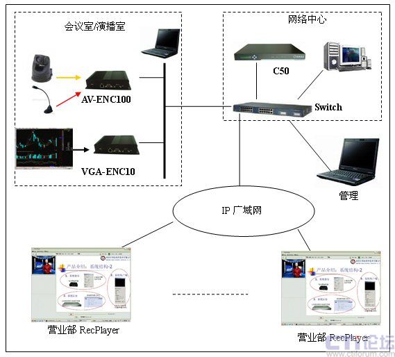 在分析了海通證券的實際需求和網(wǎng)絡(luò)環(huán)境以后,決定采用一套DSS-R-C50+來組建整個媒體廣播系統(tǒng)。系統(tǒng)由媒體采集系統(tǒng)AV-ENC100/VGA-ENC100,流媒體處理和錄制系統(tǒng)C50和媒體接收系統(tǒng)RecPlayer組成。通過此系統(tǒng)可以實現(xiàn)語音、視頻和計算機(jī)桌面的同步實時直播、錄制和點播。系統(tǒng)的結(jié)構(gòu)圖如下: