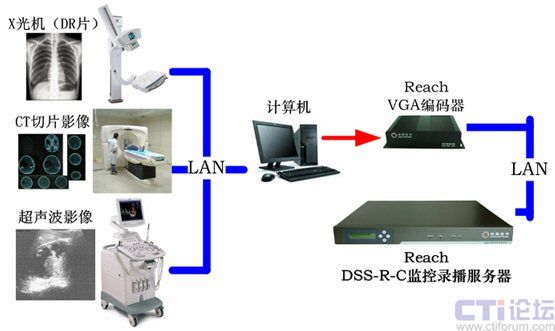 - 由于當前的大多醫(yī)療設(shè)備,如X光機、CT機均擁有網(wǎng)絡(luò)接口并支持,由計算機通過網(wǎng)絡(luò)即可采集醫(yī)療設(shè)備中的影像,并采用VGA編碼器采集計算機中的CR或DR片、CT片、演示文件(PPT、WORD、EXCEL);