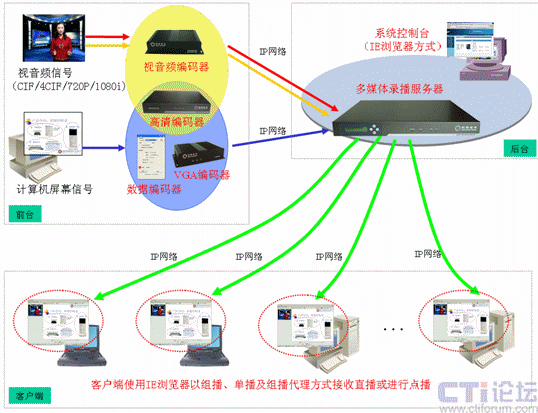 如上圖所示,會易錄采用分布式產(chǎn)品架構(gòu),前臺設(shè)備負責信號采集,后臺設(shè)備負責信號處理,前臺的編碼器可將采集的視音頻信號或VGA信號編碼后通過IP網(wǎng)絡發(fā)送給后臺的多媒體錄播服務器,多媒體錄播服務器可將收到的視音頻信號和VGA信號進行同步一體化的錄制,并提供直播及點播。