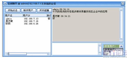 系統(tǒng)增加了多方文字互動聊天功能,在線聊天功能可以選擇給所有人員發(fā)送消息,也可以選擇給某一特定人員發(fā)送。這樣在會議或培訓(xùn)的過程中,管理員可以選擇性的提出相應(yīng)的問題給相關(guān)人員,考核相關(guān)人員的培訓(xùn)效果;其他人員也可以將會議或培訓(xùn)過程中遇到的疑問、難點及時的反應(yīng)給管理員進行解答,增強會議的成效。