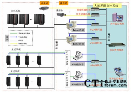 如上圖所示,該機房分為設(shè)備間和操作間,小型機等主機系統(tǒng)安裝在設(shè)備間內(nèi),平時工作人員通常在操作間內(nèi)通過Telnet終端及KVM控制臺等方式訪問主機系統(tǒng)進行操作,這些Telnet終端、KVM控制臺即為機房內(nèi)人與機器打交道的“人機界面”。