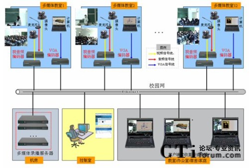 華東師大多媒體錄播項(xiàng)目系統(tǒng)組網(wǎng)如上圖所示。在本項(xiàng)目中12間多媒體教室內(nèi)均實(shí)現(xiàn)錄播功能,編碼器和多媒體錄播服務(wù)器分別部署在教室和機(jī)房內(nèi),管理員在控制室通過網(wǎng)絡(luò)進(jìn)行遠(yuǎn)程管理、控制,老師、學(xué)生可在教室、辦公室、宿舍等任何可以連接校園網(wǎng)的地方實(shí)時觀看各間教室內(nèi)進(jìn)行的課程,可滿足日常多媒體教學(xué)、課件錄制、微格教學(xué)等應(yīng)用的需要。其中涉及銳取設(shè)備清單及說明如下: