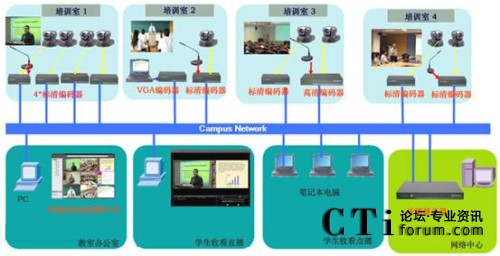 在南洋理工的商學(xué)院中有一個(gè)培訓(xùn)中心,培訓(xùn)中心中有4個(gè)培訓(xùn)課室。 商學(xué)院的老師們希望可以把這4培訓(xùn)課室中的培訓(xùn)課程錄制下來(lái),并可以同時(shí)直播到其它教室。老師可以監(jiān)控這4個(gè)培訓(xùn)課室的培訓(xùn)情況。學(xué)生可以使用PC通過(guò)校園網(wǎng)收看到實(shí)時(shí)的培訓(xùn)情況,及培訓(xùn)后的回放他們可能錯(cuò)過(guò)了的培訓(xùn)。系統(tǒng)可與NTU現(xiàn)有的E_learning系統(tǒng)無(wú)縫融合,為為豐富E_learning的課件資源提供低成本、高效率的制作手段。同時(shí)系統(tǒng)應(yīng)該便于維護(hù)及用戶界面友好,而且便于以后的擴(kuò)容。因培訓(xùn)室的功能差異,每一間培訓(xùn)室內(nèi)所需記錄的信號(hào)類型及數(shù)量均不相同,要求系統(tǒng)能夠進(jìn)行匹配和適應(yīng)。