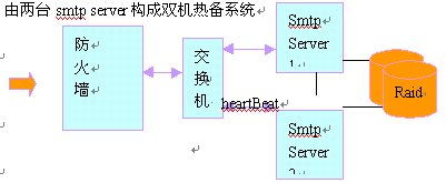 2. 2個smtp server可以構(gòu)成負(fù)載均衡,同時構(gòu)成雙機(jī)熱備份,正常情況下,smtp流量平均分配到兩臺smtp server;一旦其中一臺出現(xiàn)故障,另外一臺將自動接管smtp服務(wù)。