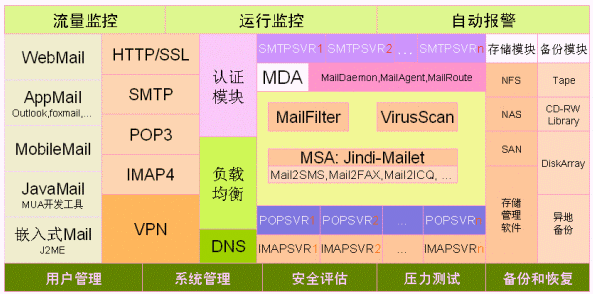 1. 郵件集群系統(tǒng)由二個smtp server、一個pop3/imap server、一個認(rèn)證服務(wù)器ldap、和磁盤陣列組成。監(jiān)控中心由流量監(jiān)控、運(yùn)行監(jiān)控、SMS報警、系統(tǒng)管理、查詢運(yùn)維終端組成。
