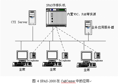 目前國內呼叫中心的建設方興未艾,企業(yè)為了改善服務,贏得客戶,紛紛建設自身的呼叫中心。如果建立呼叫中心全部采用國外設備,價格非常昂貴,使很多客戶望而卻步。這樣大的投資目前也只有電信(包括移動和聯通)、電力、銀行等資金充裕的行業(yè)才能承受。而且,根據我方了解,即使這些行業(yè)也在控制采購成本,原先只注重名牌,不計成本的情況正在改變。而在目前宏觀經濟形勢不景氣的大背景下,大中型企業(yè)既要加快企業(yè)信息化建設,保住客戶,降低成本,又要精打細算,規(guī)避投資風險。我們掌握建立呼叫中心設備的所有核心技術,因此在呼叫中心應用方面有很大的價格優(yōu)勢,這樣就降低了擁有呼叫中心的門檻,在這個市場上也有很強的競爭力。采用SPAS-2000可編程交換機支持智能業(yè)務通用編程接口,可以作為CallCenter核心設備,應用圖見圖4: