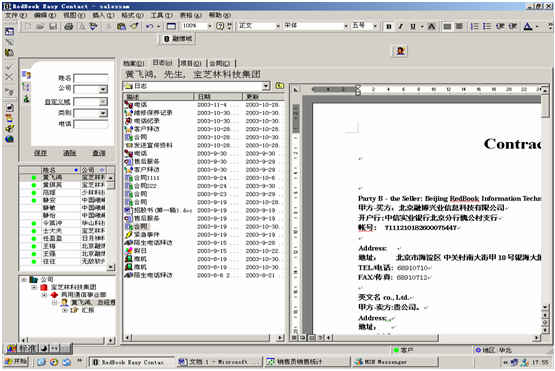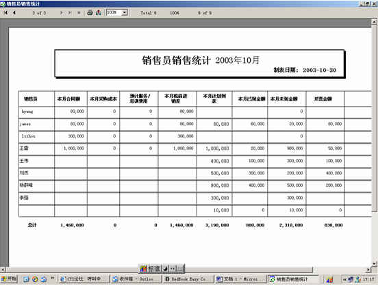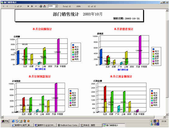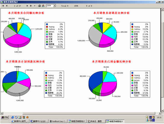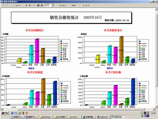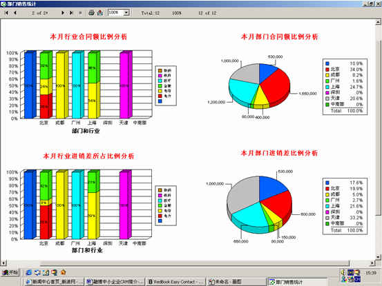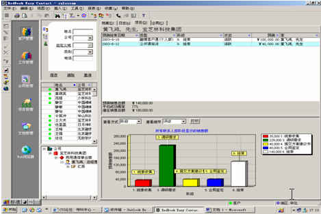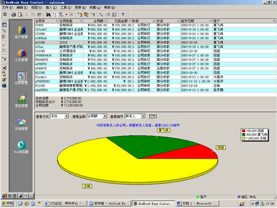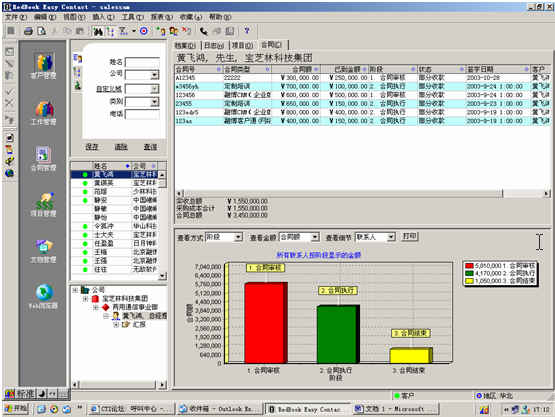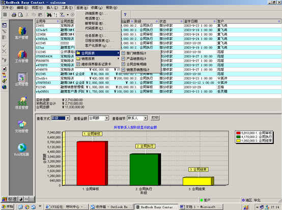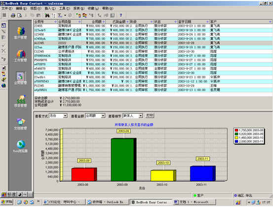 可對(duì)客戶(雇員)合同,根據(jù)合同階段、月份、合同金額、合同應(yīng)收應(yīng)付款、采購(gòu)成本、客戶、銷(xiāo)售人員等條件進(jìn)行查詢和統(tǒng)計(jì), 查詢統(tǒng)計(jì)結(jié)果以詳細(xì)列表及圖示進(jìn)行顯示。