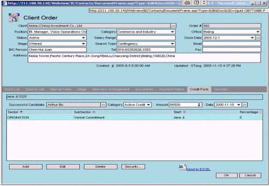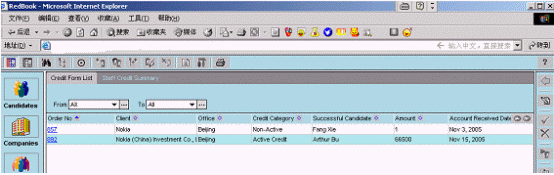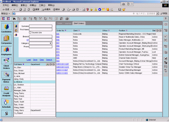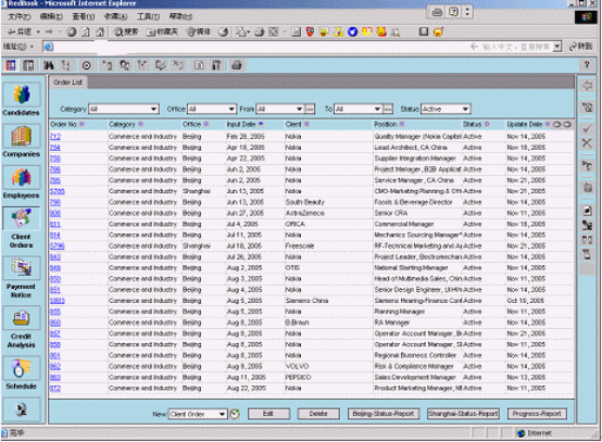 融博獵頭業(yè)務(wù)管理系統(tǒng)已經(jīng)被某著名的獵頭公司正式上線,該系統(tǒng)同時在北京、上海等五個分公司使用。根椐使用客戶反映,該系統(tǒng)功能強大、操作簡單,基本覆蓋了獵頭業(yè)務(wù)的全部內(nèi)容;各種業(yè)務(wù)流程規(guī)范、流暢;各類統(tǒng)計報表靈活、準(zhǔn)確;自動生成簡歷、客戶提交報告、催款通知、項目進(jìn)度報告,極大地提高了企業(yè)的工作效率。該系統(tǒng)與目前國際先進(jìn)的獵頭公司所使用的系統(tǒng)相比,處于領(lǐng)先的地位。