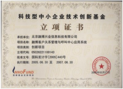 "融博客戶關系管理與呼叫中心應用系統(tǒng)"喜獲國家里科技部2005年中小企業(yè)創(chuàng)新基金的立項,以及中關村科技園區(qū)的創(chuàng)新基金!融博興業(yè)本次立項的產品是2005年北京地區(qū),乃至全國唯一獲得創(chuàng)新基金支持的CRM與呼叫中心應用軟件項目。