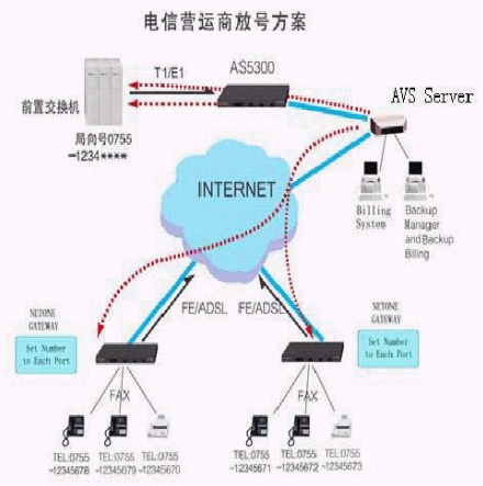 電信運營商放號方案采用寬帶數(shù)據(jù)網(wǎng)絡(luò)接入到運營商,IP電話數(shù)據(jù)流通過寬帶數(shù)據(jù)網(wǎng)絡(luò)接入運營商的局端網(wǎng)關(guān)設(shè)備,或者直接進入IP電話網(wǎng)絡(luò)。與傳統(tǒng)的電話相比,電信運營商放號方案不需要太多的額外投資購買硬件設(shè)備;只需在用戶端安裝NETONE語音網(wǎng)關(guān)或IP電話機,話吧、網(wǎng)吧、企業(yè)網(wǎng)用戶、校園網(wǎng)用戶及個人用戶就可以在現(xiàn)有的網(wǎng)絡(luò)基礎(chǔ)上實現(xiàn)IP電話放號服務(wù)。