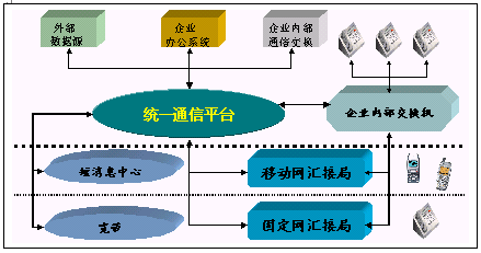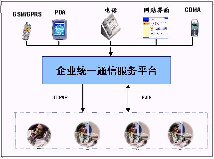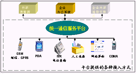 企業(yè)統(tǒng)一通信平臺(tái)提供了多種接入方式:人工坐席接入、自動(dòng)語音IVR、GPRS、WAP接入、寬帶接入、短信息接入;同時(shí)還提供了多種信息發(fā)布方式: