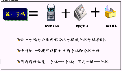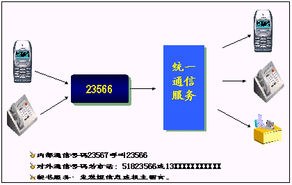 鐵路內(nèi)部員工可以統(tǒng)一所有的通信工具,只使用一個(gè)號(hào)碼,一次呼叫便可以完成通信,使通信更加簡單、可靠?梢詫(shí)現(xiàn)換機(jī)換網(wǎng)不換號(hào),用戶獲得一個(gè)終身的聯(lián)系號(hào)碼,用戶無論更換任何通信工具,聯(lián)系號(hào)碼和方式不會(huì)改變。例如:在路局領(lǐng)導(dǎo)找下屬的時(shí)候,只需要撥打他的統(tǒng)一號(hào)碼,便可以直接找到他。不必考慮他是否在外出還是在辦公室,是否更換了手機(jī)號(hào)碼。統(tǒng)一號(hào)碼就像他員工號(hào)碼,始終不變,即撥即通!