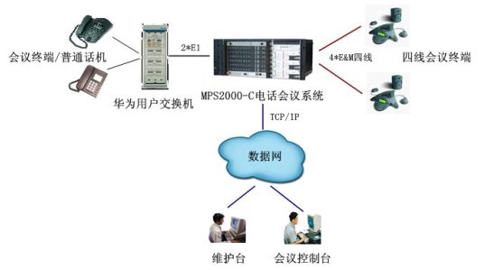 在接入上,通過2個(gè)數(shù)字中繼與華為大型用戶交換機(jī)互連,實(shí)現(xiàn)華為用戶交換機(jī)下的模擬用戶作為與會(huì)用戶的接入,也可通過華為交換機(jī)出局,實(shí)現(xiàn)PSTN網(wǎng)內(nèi)的用戶接入。
