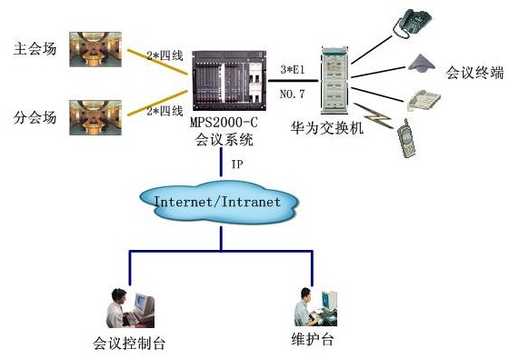該會(huì)議系統(tǒng)通過(guò)3個(gè)數(shù)字中繼,與華為用戶(hù)交換機(jī)互連,通信采用NO.7信令。4路4線中2路接主會(huì)場(chǎng)調(diào)音臺(tái),2路分會(huì)場(chǎng)調(diào)音臺(tái),實(shí)現(xiàn)會(huì)議室擴(kuò)音設(shè)備的接入。通過(guò)以太網(wǎng)口與D-LINK網(wǎng)絡(luò)交換機(jī)互連,接入廊坊電力的局域網(wǎng),實(shí)現(xiàn)維護(hù)管理及會(huì)議控制等功能。