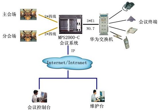該會(huì)議系統(tǒng)和廊坊電力的會(huì)議系統(tǒng)組網(wǎng)方式相同,通過(guò)3個(gè)數(shù)字中繼,與華為用戶交換機(jī)互連,通信采用NO.7信令。4路4線中2路接主會(huì)場(chǎng)調(diào)音臺(tái),2路接分會(huì)場(chǎng)調(diào)音臺(tái),實(shí)現(xiàn)會(huì)議室擴(kuò)音設(shè)備的接入。通過(guò)以太網(wǎng)口與D-LINK網(wǎng)絡(luò)交換機(jī)互連,接入秦皇島電力的局域網(wǎng),實(shí)現(xiàn)維護(hù)管理及會(huì)議控制等功能。
