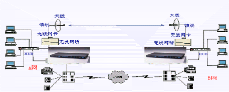 A網(wǎng)與B網(wǎng)分別為兩個(gè)局域網(wǎng),通過兩臺(tái)WavePoint II無線網(wǎng)橋?qū)蓚(gè)局域網(wǎng)連在一起,網(wǎng)橋上的RJ45口或BNC細(xì)纜接口與局域網(wǎng)相連。每臺(tái)網(wǎng)橋上插有一塊WaveLAN無線PC卡,PC卡的射頻輸出端口,通過饋線接到天線,通過PC卡來完成無線鏈路的連通。無線網(wǎng)橋連接完成后的效果類似HUB級連。IP語音網(wǎng)關(guān)-HGW-904的局域網(wǎng)接口(RJ45)連接到局域網(wǎng)的HUB上,根據(jù)用戶實(shí)際的話務(wù)量,選用Line端口接入用戶電話交換機(jī)(PBX),PBX接普通電話機(jī)和傳真機(jī),并連接至電話公網(wǎng)(PSTN)。其中所需設(shè)備:HGW-904 IP語音網(wǎng)關(guān)2臺(tái);PBX或電話機(jī)的配置可根據(jù)用戶實(shí)際需求;無線網(wǎng)橋2臺(tái);無線網(wǎng)卡2塊;天線兩套;饋線若干。 此方案亦可應(yīng)用于兩個(gè)需要連接的局域網(wǎng)之間有障礙物遮擋而不可視的情況。此時(shí)只需在水平或垂直方向?qū)ふ乙粋(gè)能同時(shí)看到A與B的位置,并在此位置加入中繼網(wǎng)橋,即可實(shí)現(xiàn)A網(wǎng)與B網(wǎng)的連接。實(shí)際應(yīng)用中,設(shè)置各異地IP語音網(wǎng)關(guān)的對應(yīng)代碼,在PBX上設(shè)定代表撥打IP電話的數(shù)字,代表PSTN外線電話的數(shù)字。此無線組網(wǎng)方式其實(shí)就是已有企業(yè)網(wǎng)的方式,可以完美解決特定地區(qū)布線的困難。特別是廣東地區(qū),工廠特別多,發(fā)展也特別快。有非常多的客戶可以用這種方式來滿足數(shù)據(jù)傳輸及VOIP的需求。