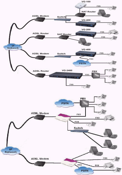 公司已建有Internet或VPN企業(yè)數(shù)據(jù)網(wǎng)絡(luò),對于這種情況,安裝VOIP設(shè)備十分簡單,也非常容易理解?偣救缭拕(wù)量很大時(shí),可選一臺(tái)或多臺(tái)HSP-2000做堆疊,使用IP sharing功能,以節(jié)省公有(global)IP地址。一般的分公司可選擇1臺(tái)VG-902或VG-904做語音網(wǎng)關(guān)。各個(gè)點(diǎn)配置的IP接入網(wǎng)關(guān)都可與各種類型的用戶交換機(jī),集團(tuán)電話相連接。移動(dòng)用戶也可通過本地的VOIP網(wǎng)關(guān)撥打長途電話。沒有專用網(wǎng)絡(luò),采用ADSL上網(wǎng)的企業(yè)也可應(yīng)用Internet建立自己的IP電話網(wǎng)絡(luò)。由于ADSL撥號(hào)上網(wǎng)一般不能分配到固定的IP地址,IP語音網(wǎng)關(guān)連接在局域網(wǎng)上,配置的是局域網(wǎng)內(nèi)部IP地址,所以每次上網(wǎng)后不能自動(dòng)獲取對方的IP地址,導(dǎo)致不能通信。HSP-2000采用獨(dú)有的嵌入式Gatekeeper技術(shù)和設(shè)計(jì),支持PPPoE & DHCP 動(dòng)態(tài)的IP,完全解決了上述問題,滿足了ADSL用戶VOIP的需求。