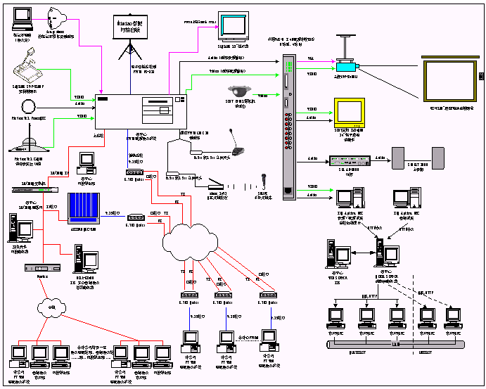 1、 電視會議系統(tǒng)包括一臺MCU和13臺iPower900,通過IP網(wǎng)絡和E1專線兩種線路連接。為了將視頻會議的功能進行擴展,我們增加了多種外圍設備,包括:實物投影儀、白板掃描儀、無線話筒、DV31攝像機等輸入設備,彩色電視機、三菱投影機和功放、音箱等輸出設備以及8×4視頻切換矩陣。