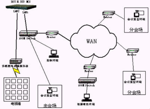 多點控制器采用鼎視通公司的DST H.323 MCS多點控制單元。DST H.323 MCS是鼎視通公司最新研制開發(fā)的高性能媒體交換設備,提供在分組交換網絡平臺之上的多種媒體交換服務。其面向的用戶既可以是企業(yè)、機關、學校等中小規(guī)模用戶,也可以是網絡運營商、業(yè)務提供商等大型用戶。并且它是唯一一款支持電視墻輸出的多點控制單元,同時結合鼎視通公司的多畫面電視墻服務器實現主會場電視墻的輸出。