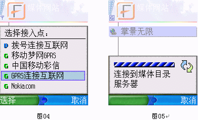 選擇" GPRS 連接互聯(lián)網(wǎng)"后,開(kāi)始通過(guò) GPRS 連接媒體目錄服務(wù)器,見(jiàn)下圖所示 :(圖04、05)