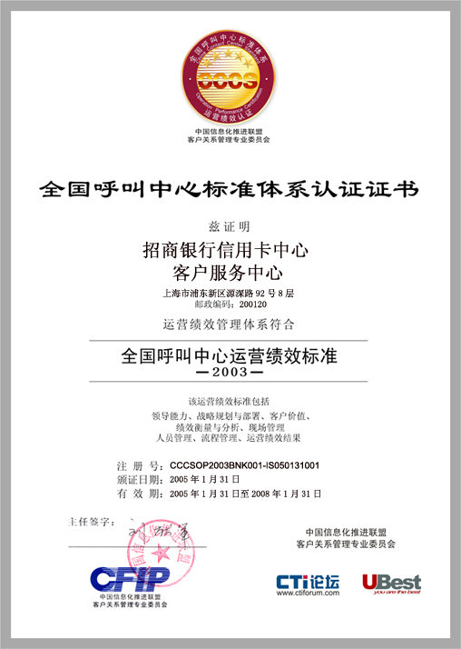 經(jīng)過(guò)長(zhǎng)達(dá)8個(gè)月時(shí)間的準(zhǔn)備和嚴(yán)格的認(rèn)證審核,由中國(guó)信息化推進(jìn)聯(lián)盟客戶關(guān)系管理專業(yè)委員會(huì)常務(wù)副主任郭晨東先生親自掛帥組成的項(xiàng)目評(píng)審專家小組從領(lǐng)導(dǎo)能力、戰(zhàn)略規(guī)劃與部署、客戶價(jià)值、績(jī)效衡量與分析、現(xiàn)場(chǎng)管理、人員管理、流程管理、運(yùn)營(yíng)績(jī)效結(jié)果等八個(gè)范疇對(duì)招商銀行信用卡中心客戶服務(wù)部進(jìn)行了全面而嚴(yán)格的審核,涉及五大類上百項(xiàng)詳細(xì)的運(yùn)營(yíng)績(jī)效指標(biāo),歷經(jīng)初審評(píng)估、現(xiàn)場(chǎng)初審、初審評(píng)估報(bào)告提交與確認(rèn)、標(biāo)準(zhǔn)試運(yùn)行、績(jī)效全面提升、最終評(píng)審等階段,最終審核確認(rèn)招商銀行信用卡中心客戶服務(wù)完全符合并部分超越《全國(guó)呼叫中心運(yùn)營(yíng)績(jī)效標(biāo)準(zhǔn)》(CCCS-OP-2003)的各項(xiàng)標(biāo)準(zhǔn)指標(biāo)和要求,于2005年1月31日正式批準(zhǔn)招商銀行信用卡中心通過(guò)該標(biāo)準(zhǔn)的五星級(jí)認(rèn)證,授予“五星級(jí)客戶服務(wù)中心”稱號(hào)。
