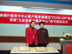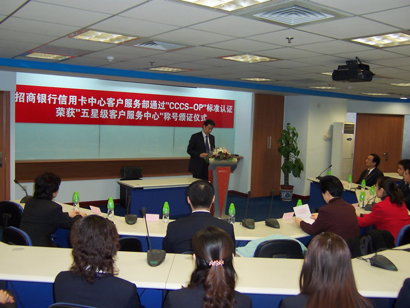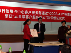 這天的上午10點(diǎn)30分,在招商銀行信用卡中心上海總部舉行了簡(jiǎn)約而隆重的頒證儀式,信用卡中心常務(wù)副總經(jīng)理梁瑤蘭從信息產(chǎn)業(yè)部電子信息中心副主任、中國(guó)信息化推進(jìn)聯(lián)盟秘書(shū)長(zhǎng)劉獻(xiàn)軍手中接過(guò)證書(shū),標(biāo)志著國(guó)內(nèi)第一家五星級(jí)客戶服務(wù)中心誕生了!