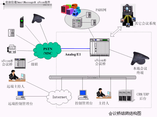 uVcon®會議橋是優(yōu)創(chuàng)科技(www.chinactn.com)的多媒體通信平臺SmartMessage®(見附錄)產品系列的音頻產品,功能包括建立會議、消息發(fā)布控制、會議數(shù)據(jù)記錄等功能。