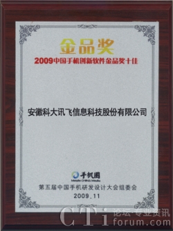 科大訊飛獲“2009中國手機(jī)創(chuàng)新軟件金品獎(jiǎng)十佳”企業(yè)