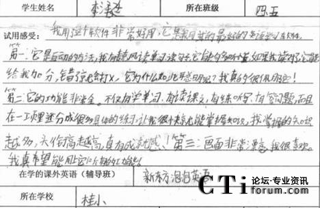 CTI論壇(ctiforum)1月21日消息(記者 潘婷婷):2010年12月,科大訊飛在天津市的兩所小學(xué)舉辦了暢言互動英語學(xué)生版試用體驗活動,同學(xué)們積極參與,在校園內(nèi)掀起了一股練聽力、學(xué)口語的英語學(xué)習(xí)熱潮。通過實際試用體驗,暢言互動英語學(xué)生版學(xué)習(xí)產(chǎn)品以其強大、實用的學(xué)習(xí)功能,得到了廣大家長、學(xué)校師生的一致認可和充分肯定。
