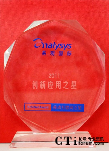 易觀國際成立于2000年,是中國信息化、互聯(lián)網(wǎng)和新媒體以及電信運(yùn)營行業(yè)規(guī)模最大的中國科技市場領(lǐng)先的研究和咨詢機(jī)構(gòu)。2011易觀“EnfoNet Award–移動(dòng)互聯(lián)網(wǎng)之星”評選是易觀年度產(chǎn)業(yè)盛會(huì)——首屆移動(dòng)互聯(lián)網(wǎng)博覽會(huì)暨第四屆易觀移動(dòng)互聯(lián)網(wǎng)年會(huì)的重要組成部分,是易觀國際(Analysys International)為推薦中國互聯(lián)網(wǎng)及移動(dòng)互聯(lián)網(wǎng)產(chǎn)業(yè)中表現(xiàn)優(yōu)異且具備發(fā)展?jié)摿Φ钠脚_(tái)及應(yīng)用而設(shè)立。