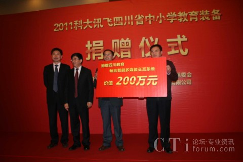 CTI論壇(ctiforum)11月11日消息(記者 潘婷婷): 2011年11月10日,科大訊飛在成都嬌子國際會議中心舉行了隆重的捐贈儀式,向四川省各市、地州中小學捐贈了價值200萬元的暢言系列教學產(chǎn)品。會議由四川省教育廳技術(shù)物資裝備處處長張生主持,四川省教育廳副廳長張林祥、科大訊飛副總裁徐玉林在儀式上致辭,來自各市、地州教育主管部門領(lǐng)導、各縣區(qū)教育局負責人、受贈學校教師代表,以及相關(guān)媒體共100多人等參加了捐贈儀式。