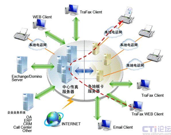應(yīng)用TraFax Enterprise Server拓敏傳真服務(wù)器系統(tǒng)企業(yè)版所部署的中心傳真服務(wù)器同時支持本地、異地多板卡服務(wù)器接入,從而使集團企業(yè)的傳真資源能夠?qū)崿F(xiàn)真正高效、安全的集中管理,員工可以從他們的電腦桌面直接收發(fā)、瀏覽、編輯、轉(zhuǎn)發(fā)以及查找傳真文件。服務(wù)器接收的傳真自動分發(fā)給正確的接收人,支持語音提示、能夠與當(dāng)前幾乎所有主流應(yīng)用系統(tǒng)進行無縫集成,支持雙機熱備份,具有高度的系統(tǒng)可靠性。