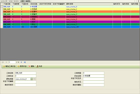 2)自定義工單:根據(jù)所定義的不同類(lèi)型工單,用戶(hù)還可以靈活定制每種工單的具體內(nèi)容,并且還可以設(shè)置顯示的顏色,可以更明顯的區(qū)分不同狀態(tài)的工單、顯示顏色等。如圖6和7所示: