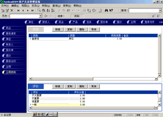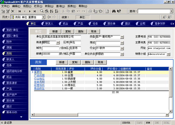 客戶單位的分類較聯(lián)系人的分類更復(fù)雜。常用的分類有:按照企業(yè)規(guī)模來分類(大、中、小,層次自定義,下同)、按照該客戶與本單位的緊密程度分類(緊密、普通、疏遠(yuǎn))、按照該客戶的重要性分類(重要、普通、次要)、按照該客戶的忠誠度分類(忠誠、普通、游移)。有一些用戶企業(yè),希望對(duì)客戶單位特征進(jìn)行采集,進(jìn)而進(jìn)行客戶信用評(píng)價(jià)。信用特征的類別可以多達(dá)數(shù)十種類(詳細(xì)情況可參考有關(guān)書籍)。利用SynleadCRM,您可以為每個(gè)類指定系數(shù),為類下屬的每個(gè)評(píng)價(jià)指定評(píng)分分值。例如,您可以建立一個(gè)類別為"客戶倉庫積壓商品的情況",系數(shù)為1,該類別下屬的評(píng)價(jià)有"很多1分"、"一般3分"、"少1分"、"未知0分",如果指定某客戶該類別的評(píng)價(jià)為一般,則該項(xiàng)目得分為3分*1(系數(shù))=3分。依此類推,您還可以指定更多的分類與評(píng)價(jià),例如:客戶經(jīng)營場(chǎng)所所處的位置、客戶在企業(yè)生命周期中所處的位置、客戶在行業(yè)中的地位、客戶產(chǎn)品的組合情況、客戶產(chǎn)品覆蓋的市場(chǎng)范圍、客戶產(chǎn)品的淡旺季規(guī)律、客戶近年?duì)I業(yè)額的增減趨勢(shì)、客戶的年度營業(yè)額、客戶的現(xiàn)金周轉(zhuǎn)能力、客戶的負(fù)債情況、客戶是否涉及中大訴訟等。每一個(gè)類別項(xiàng)目的評(píng)分經(jīng)過系數(shù)的加權(quán)運(yùn)算后,可以求和,得到這個(gè)客戶的總評(píng)分。未來也可以利用分析模型對(duì)此類數(shù)據(jù)進(jìn)行進(jìn)一步的分析,提供輔助決策所需要的圖表和報(bào)表。