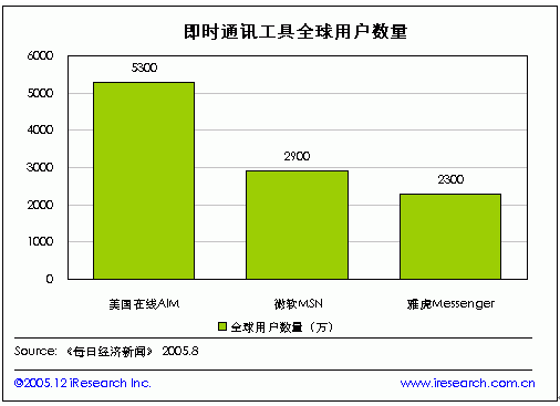 iResearch艾瑞市場(chǎng)咨詢根據(jù)《每日經(jīng)濟(jì)新聞》近期發(fā)表的調(diào)查數(shù)字整理發(fā)現(xiàn),截至2005年8月,美國(guó)在線(AOL)的即時(shí)通訊工具用戶數(shù)量達(dá)到了5300萬(wàn)人,居所有即時(shí)通訊工具的首位。微軟的MSN用戶數(shù)量達(dá)到2900萬(wàn)人,雅虎Messenger的用戶數(shù)量為2300萬(wàn)人。