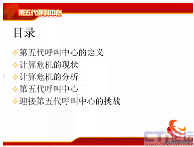 我把第五代呼叫中心的概念詳細地論述一下。主要是分成五個部分,第一個是第五代呼叫中心的定義;第二個計算危機的現狀;第三是計算危機的分析;第四第五代呼叫中心;第五是結論——迎接第五代呼叫中心的挑戰(zhàn)。