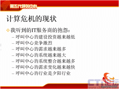 我們聽到IT服務商的抱怨可就更多了,說呼叫中心建設投資越來越低了,我在十年前建設一個20個座席的呼叫中心,能掙1500萬;可是現在20個座席的呼叫中心,10萬塊錢就把我打發(fā)了。呼叫中心競爭越來越激烈,投一個標,雖然一個呼叫中心只有100萬,這時候來的廠家有50家,相互壓價,相互壓價,這時候利潤都沒有了,F在的需求是越來越多了,體現在各個環(huán)節(jié),運營管理和業(yè)務模式上需求越來越多,最終客戶的要求也是越來越多,系統(tǒng)越來越大了,服務器也一大堆,以前一兩個服務器就夠了,現在需要4、5個,7、8個,這些服務器還需要相互進行聯絡整合,系統(tǒng)的整合越來越多,比如要和ERP整合,要和CRM整合,要和供應鏈整合,系統(tǒng)的整合越來越多,而且需求變化越來越大,呼叫中心需求的變化產生于很多方面,后面我會仔細介紹。呼叫中心的行業(yè)變成一個夕陽行業(yè)了,這是現在做IT服務商普遍在提的想法。
