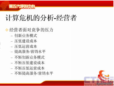 那么經營者的壓力就更大了,首先我要創(chuàng)新業(yè)務模式,我以前是做客戶服務的,現在我要掙錢,我要增加收入,我要做電話營銷,壓低建設成本,壓低運營成本,這個是大家很容易理解的。同時他是不斷地創(chuàng)新業(yè)務模式,不斷地壓低建設成本,不斷地壓低運營成本,不斷地提高服務水平,這個不斷就給IT服務者傳遞了更大壓力。
