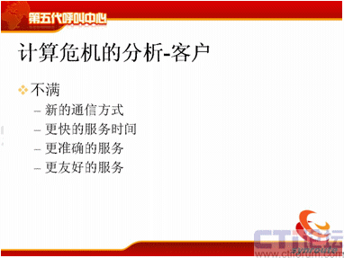 現在我們就分析一下后果,這時候計算危機的分析對于客戶來說,新的通訊方式我們都需要,可是呼叫中心沒有公布,我無法使用,更快的服務時間,大家看到了,比如說Web Chat,目前我點擊了80%是直接進入留言的頁面,也就是說這時候沒有人工來服務了,或者是等待時間非常非常長,一個小時以后告訴我,排隊已經到了,已經沒有人能為我服務的,服務時間是根本沒有辦法保證的。第三個方面我們要更準確的服務,電話打進去以后告訴我的信息和網絡告訴我的信息是完全不一樣的呢?為什么呢?因為它的知識庫沒有關聯起來,業(yè)務流程沒有關聯起來,這種更友好的服務,考核的指標都是一樣的。