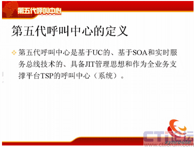 第五代呼叫中心的定義比較簡單,第五代呼叫中心是基于UC的,基于SOA和實時服務總線技術的,具備JIT管理思想和作為全業(yè)務支撐平臺TSP的呼叫中心系統(tǒng)。