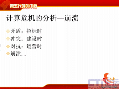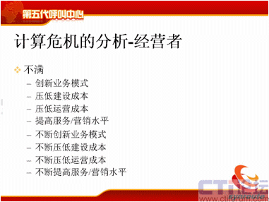 計算危機的下一方面是運營管理者,可能在座很多人是做運營管理的,你們會不斷去跟IT服務者提需求,我下一個月想引進新的聯絡方式,下個月我想引進新的軟件,引進新的流程,我想增加KPI指標,我想增加現場的管理手段,我想提高座席的工作效率,后面也是不斷的,不斷地去引入新的聯絡方式。